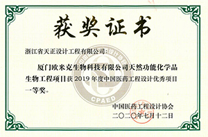 近日,根据中国医药工程设计协会《关于公布“2019年度全国医药优秀工程设计”推荐结果》(药设协字〔2020〕第04号),公司4个项目荣获2019年度全国医药优秀工程设计奖。其中:厦门欧米克生物科技有限公司天然功能化学品生物工程项目荣获一等奖,正大青春宝(德清)药业有限公司固体制剂及中药物提取注射剂项目荣获二等奖,三圣药业有限公司医药项目和浙江新东港药业股份有限公司固体制剂项目荣获三等奖。